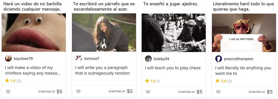 Un ejemplo de los servicios en categorías de cosas raras y divertidas sería hacer un video cantando feliz cumpleaños a alguien en especial, dibujar un personaje cómico, tomarte fotos sosteniendo un cartel junto a un punto de referencia en tu área, hacer cualquier cosa que el cliente pida, enseñar a jugar ajedrez, etc.