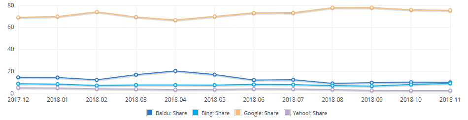 De acuerdo con la participación en el mercado neto, el porcentaje de participación de marketing global, en términos de uso de los motores de búsqueda, en el informe de netmarketshare en noviembre, 2018 favoreció mucho a Google a lo largo de 2018, el 73.04% de las búsquedas fueron impulsadas por Google.