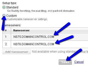 domains-settings3- Haz clic en Custom, luego borra los nombres de servidores de Godaddy y pone los de Bluehost que son: