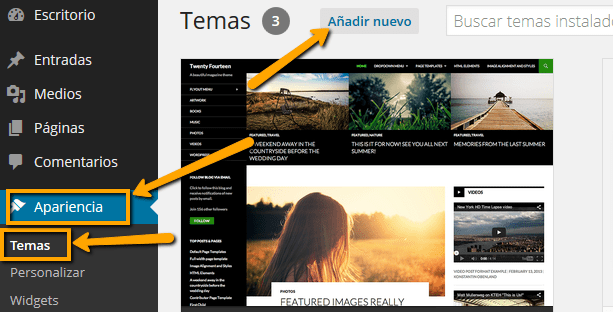 La forma más fácil de instalar temas y plugins para los sitios de WordPress es ir al repositorio de temas de WordPress lo cual se puede hacer directamente del escritorio de su blog.