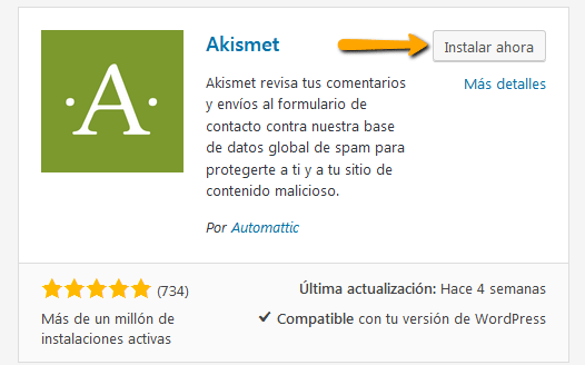 Vamos a instalar el plugin Akismet, que es para prevenir el spam. Este plugin ya viene instalado, pero para enseñarle como se buscan y como se instalan los plugins haremos cuenta que no está instalado.