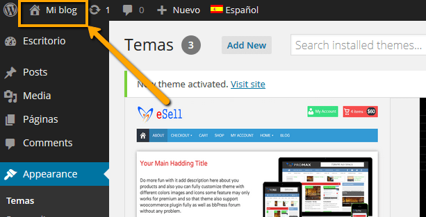 Para ver su nuevo tema instalado, haga clic arriba hacia la izquierda a donde esta la casita.